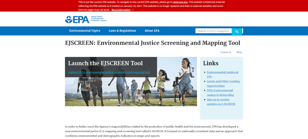 Screenshot taken by the author on February 25th. The 2017 snapshot of the EPA’s website displays the previous homepage of EJScreen.